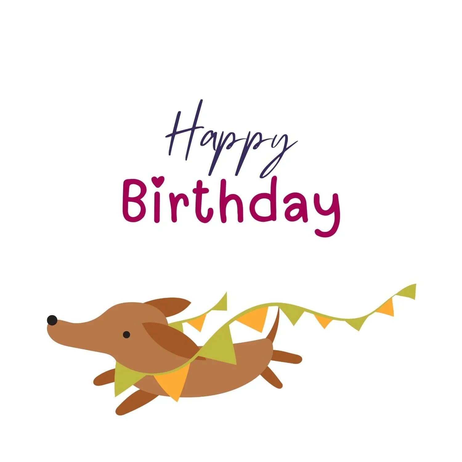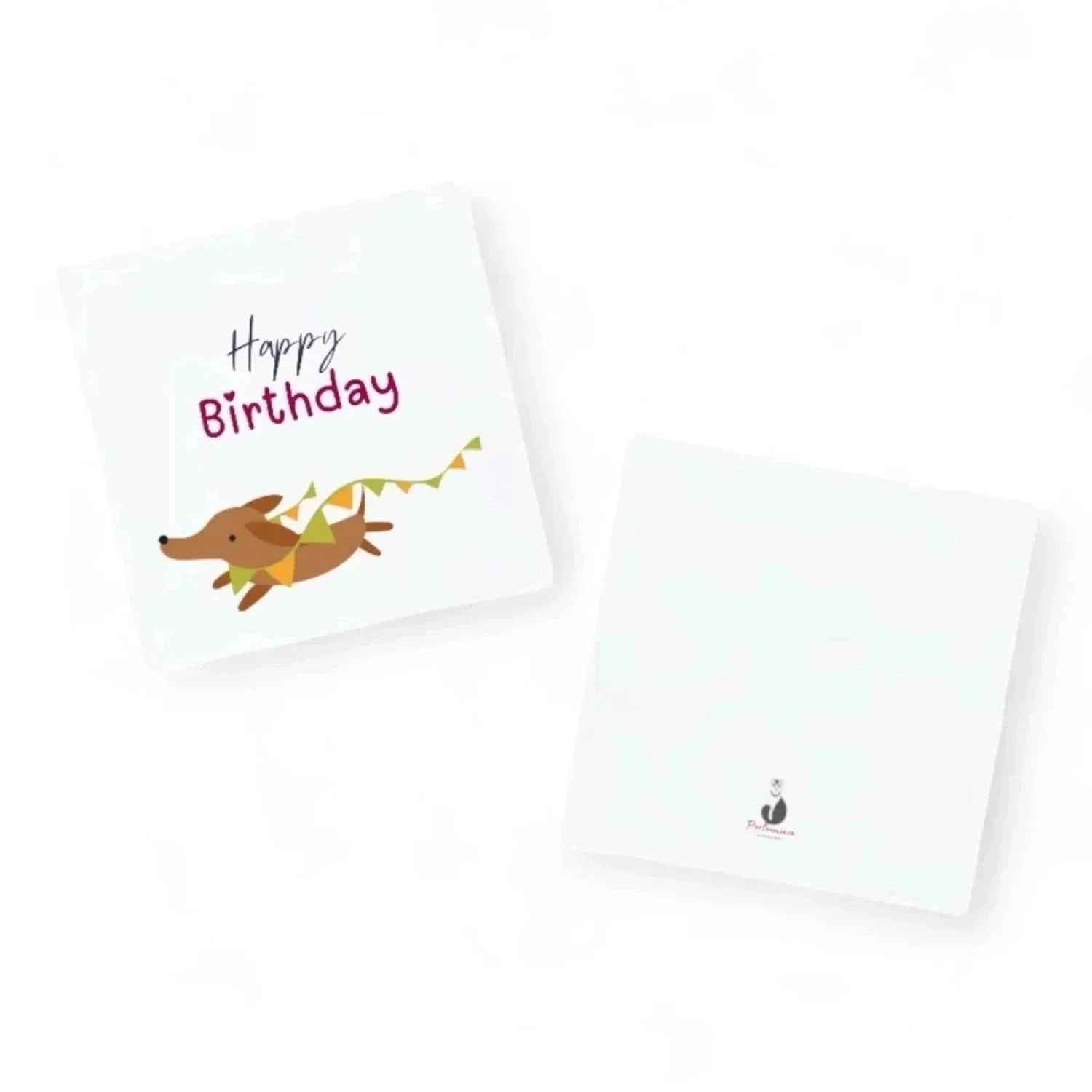 Die passende Grußkarte für dein Schmuckgeschenk zum Geburtstag: ein fröhlicher Dackel wünscht „Happy Birthday“. Die Rückseite der Karte ist beschreibbar und wird durch ein kleines Perlenmieze-Logo am unteren Rand abgerundet.