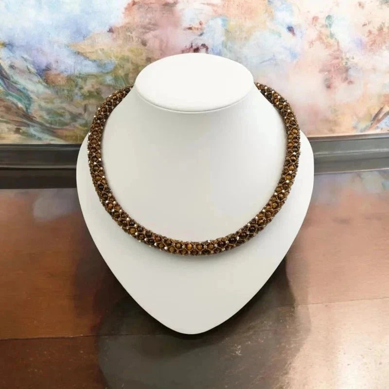 Unsere Tigerauge Kette vereint kunstvolle Handarbeit mit hochwertigen Materialien. Sie ist das perfekte Schmuckstück für Frauen, die eleganten Edelstein Schmuck lieben. In aufwendiger Netztechnik wurden feine Tigerauge Perlen, Kristalle von Preciosa® und Miyuki-Rocailles kunstvoll miteinander verwoben. Das Ergebnis: ein sanft schimmerndes Collier, das bei jedem Lichtspiel seine goldbraunen und honigfarbenen Nuancen entfaltet.
